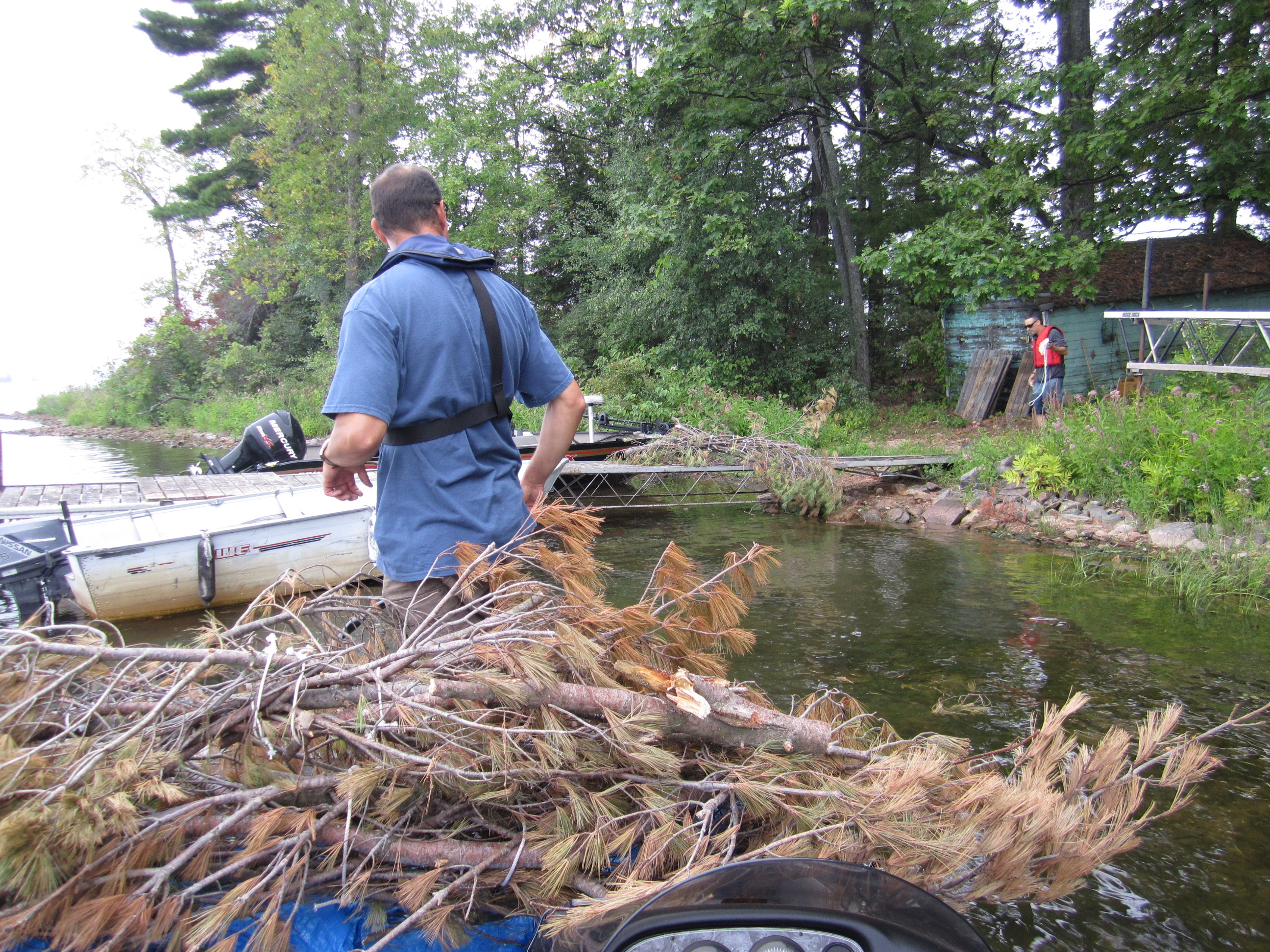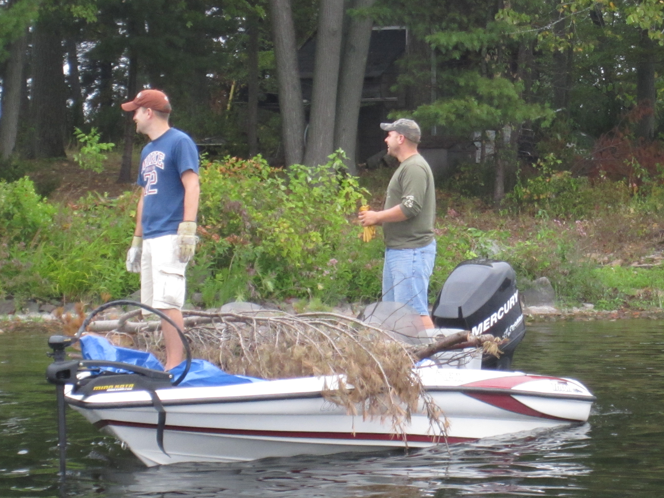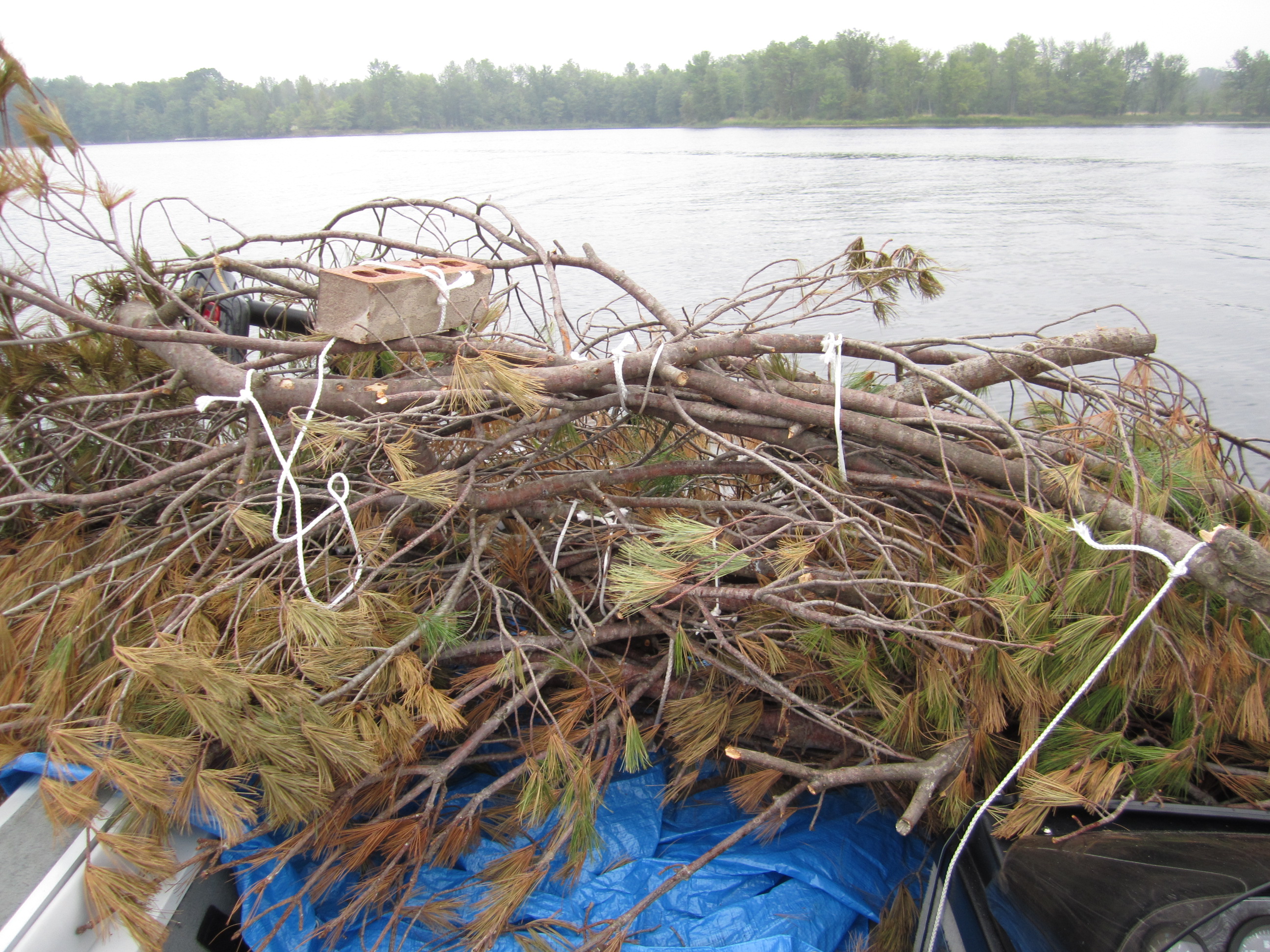 On Saturday, September 3rd 2011, members of the Ottawa Valley South Bassmasters held its second Tree Drop Event on Mississippi Lake as part of the chapters commitment to conservation. The first Tree Drop Event was held the previous year on the same body of water with great success. The purpose of the "tree drop" is to create fish cover and habitat for all species of fish, not just bass, using bundles of old cedar/pine trees anchored in place with concrete blocks or bricks. With approval and funding from the MNR Program, Community Fisheries and Wildlife Involvement Program (CFWIP), it was another successful tree drop. Also a big thank you to the cottage owner on the lake that donated the trees from his property.