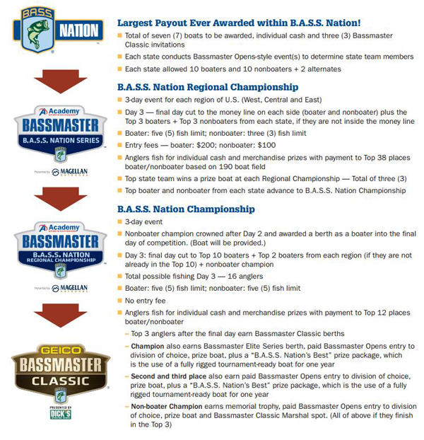 At the B.A.S.S Nation Championship, the Top boater and non-boater from each of the B.A.S.S. Nation compete for one of the Three Nation spots in the Bassmaster Classic. Full details below.